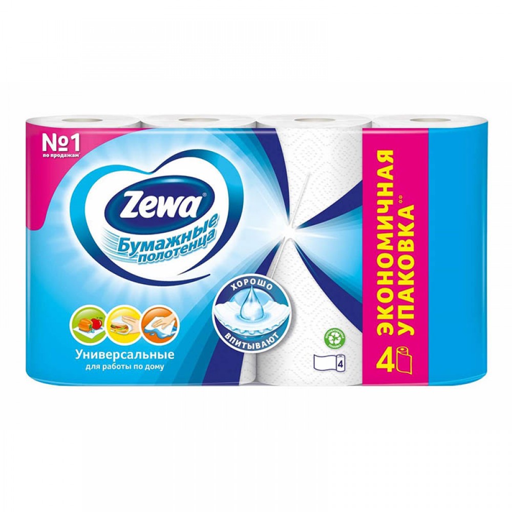 Полотенца кухонные ZEWA 4 рулона. Двухслойные бумажные полотенца с тиснением ZEWA станут незаменимым помощником в доме благодаря своим впитывающим свойствам.