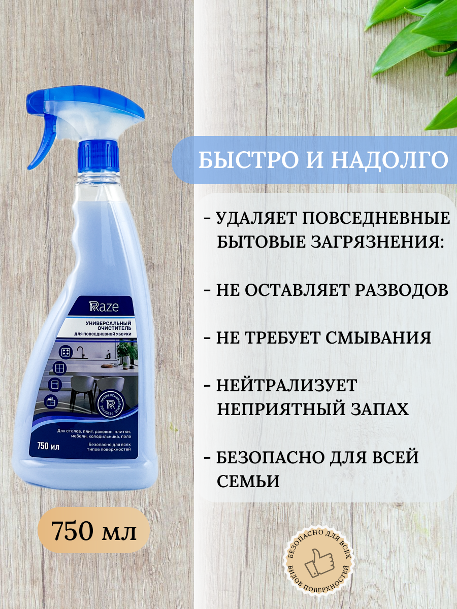 RAZE Универсальный очиститель-спрей для повседневной экспресс-уборки различных поверхностей из стекла, керамики, фарфора, металла, пластика, линолеума, ламинированных покрытий, натурального и искусственного камня в быту.