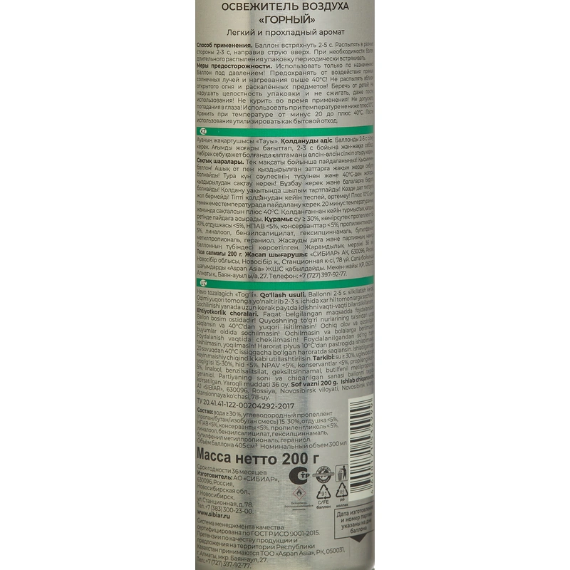 Состав: вода, углеводородный пропеллент 15-30%, отдушка < 5%, нпав < 5%, консерванты < 5%, пропиленгликоль < 5%.
