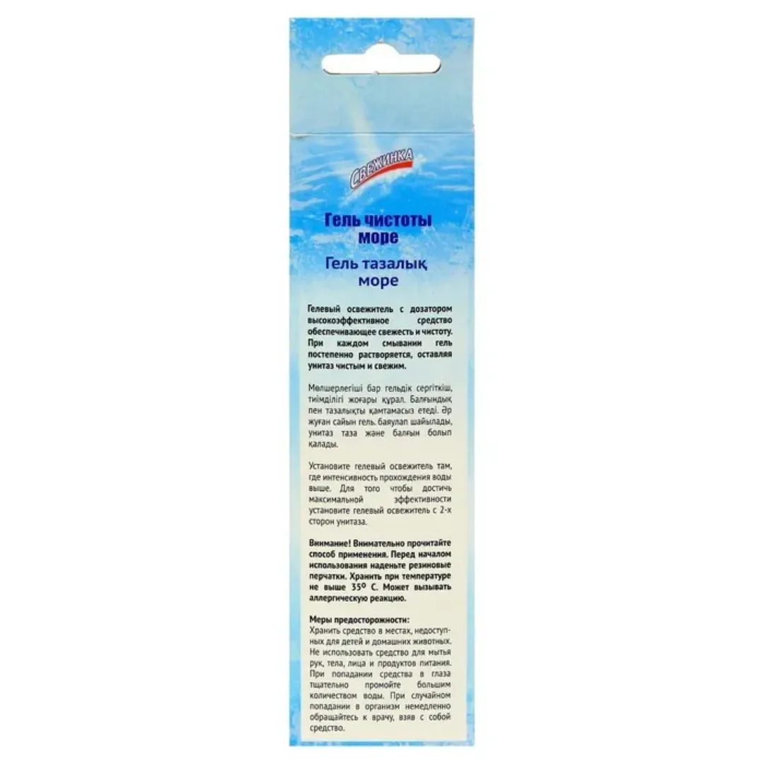 Освежитель гелевый WC дозатором СВЕЖИНКА представляет собой моющее средство для унитаза, которое имеет гелевую текстуру. Такой гель освежитель препятствует отложению известкового налёта, водного и мочевого камня. Помимо этого распространяет невероятно приятный морской аромат, который затмевает собой все остальные. Служит продолжительное время.