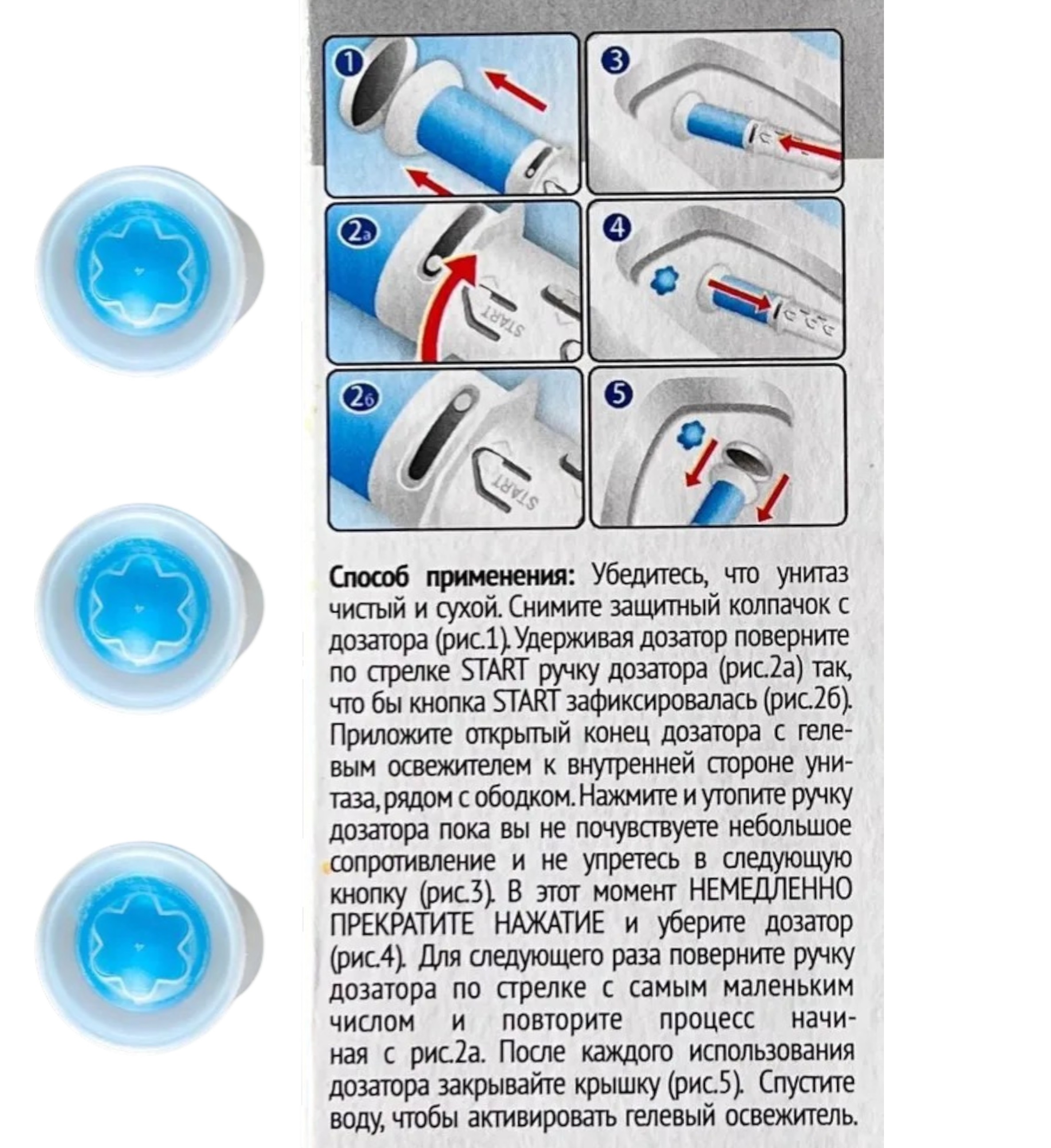 Убедитесь что унитаз сухой и чистый. Удерживая дозатор поверните по стрелке START ручку дозатора так чтобы кнопка START зафиксировалась. Установите освежитель воздуха на ровную горизонтальную поверхность. Нажмите ручку дозатора пока вы не почувствуете небольшое сопротивление и не упрётесь в следующую кнопку. Уберите дозатор.