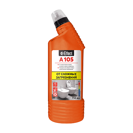 Средство для сантехники EFFECT ALFA 105 для чистки сложных устойчивых загрязнений санузлов, удаления известкового налета и ржавчины с поверхности унитазов. Растворяет кальцевые и минеральные отложения. В концентрированном виде может применяться для удаления цементного раствора в послестроительной уборке. Используется на кислотно-устойчивых поверхностях (кроме хрома, алюминия, мрамора, натурального камня, сплавов).