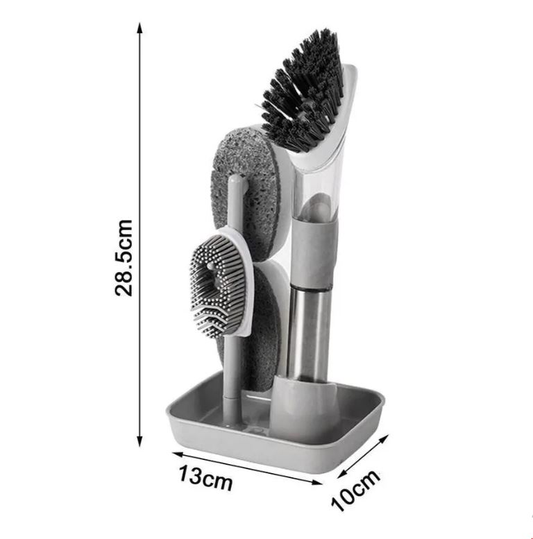 Щетка для посуды с дозатором и 4 сменными насадками – незаменимый помощник для каждой хозяйки. В комплекте идет силиконовая щетка для мягкого и бережного ухода, классическая губка, губка с абразивом для интенсивного воздействия и щетка из ПВХ для самых стойких загрязнений. В ручку щетки встроен резервуар для моющего средства, благодаря которому, средство расходуется экономнее, а ваша кожа не страдает от воздействия воды и химии. Для удобства хранения кухонного девайса на ручке есть крючок. Эта кухонная щетка идеально подходит для любой посуды, хорошо подходит для чистки плиты, ванны, раковины, а также для чистки стен, стола, мытья стекла и гриля. Теперь нет необходимости в отдельной губке, ведь эта щетка обеспечивает всестороннюю очистку. Диспенсер уменьшает расход воды и жидкости для мытья посуды. Нейлоновая хозяйственная щётка мытья для посуды с высоким ворсом средней жесткости справится с нагаром с кастрюль и сковородок, легко прочистит все труднодоступные места, ребристые поверхности гриля, решетки. Губка для посуды прекрасно справится с самыми стойкими загрязнениями без применения сильных моющих средств. Скребок в конструкции насадок - серьёзное оружие в борьбе с неприятными остатками пищи, которые трудно отмыть.