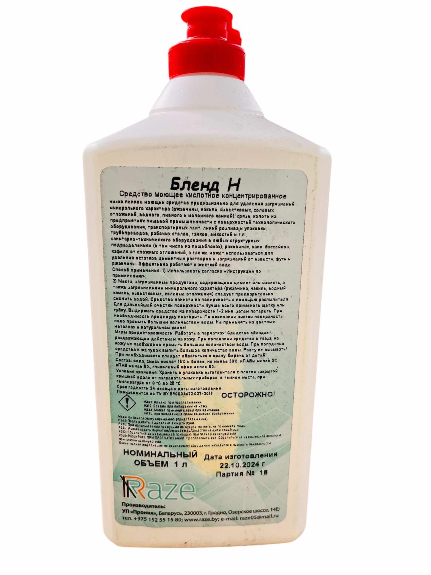 Средство для сантехники RAZE БЛЕНД Н кислотное низкопенное моющее средство на основе смеси кислот. Рекомендуется использовать для удаления загрязнений минерального характера (ржавчина, накипь, известковые, солевые отложения, водный, пивной и молочный камень) в мясо-, молоко-, рыбоперерабатывающей, масложировой, пивобезалкогольной, ликероводочной, винодельческой, кондитерской отраслях, в быту, а также на предприятиях общественного питания, торговли, коммунальных служб, продовольственных рынках, для мойки специализированного транспорта (молоковозы, квасные бочки, кеги и т.п.) Эффективно работают в жесткой воде.
