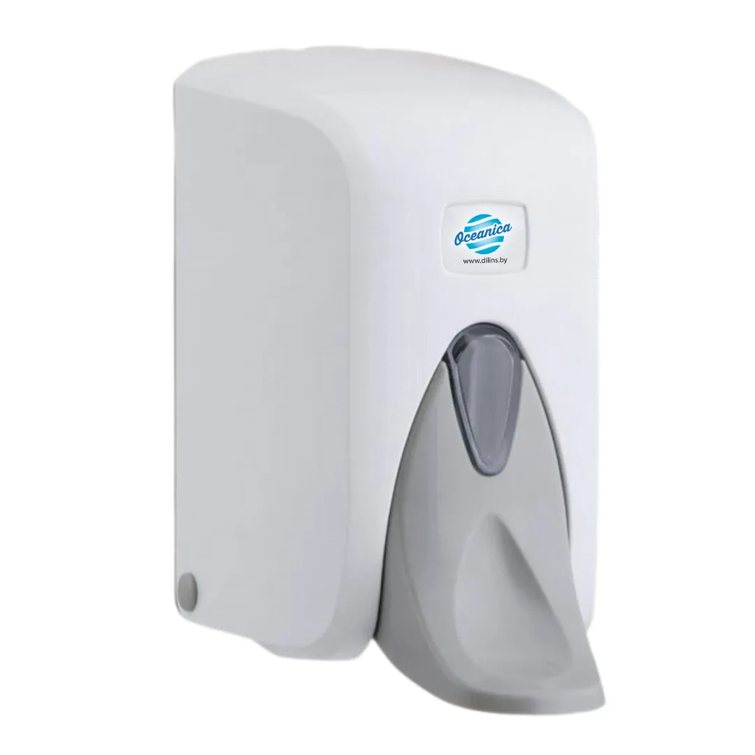 Дозатор для жидкого мыла и дезинфицирующих изготовлен из высококачественной пластмассы белого цвета. Внизу корпуса находится надежная и удобная кнопка, которая дает возможность нажатия локтем для подачи мыла или антисептика. На корпусе находится смотровое окно, что дает возможность контроля за уровнем расходного материала.