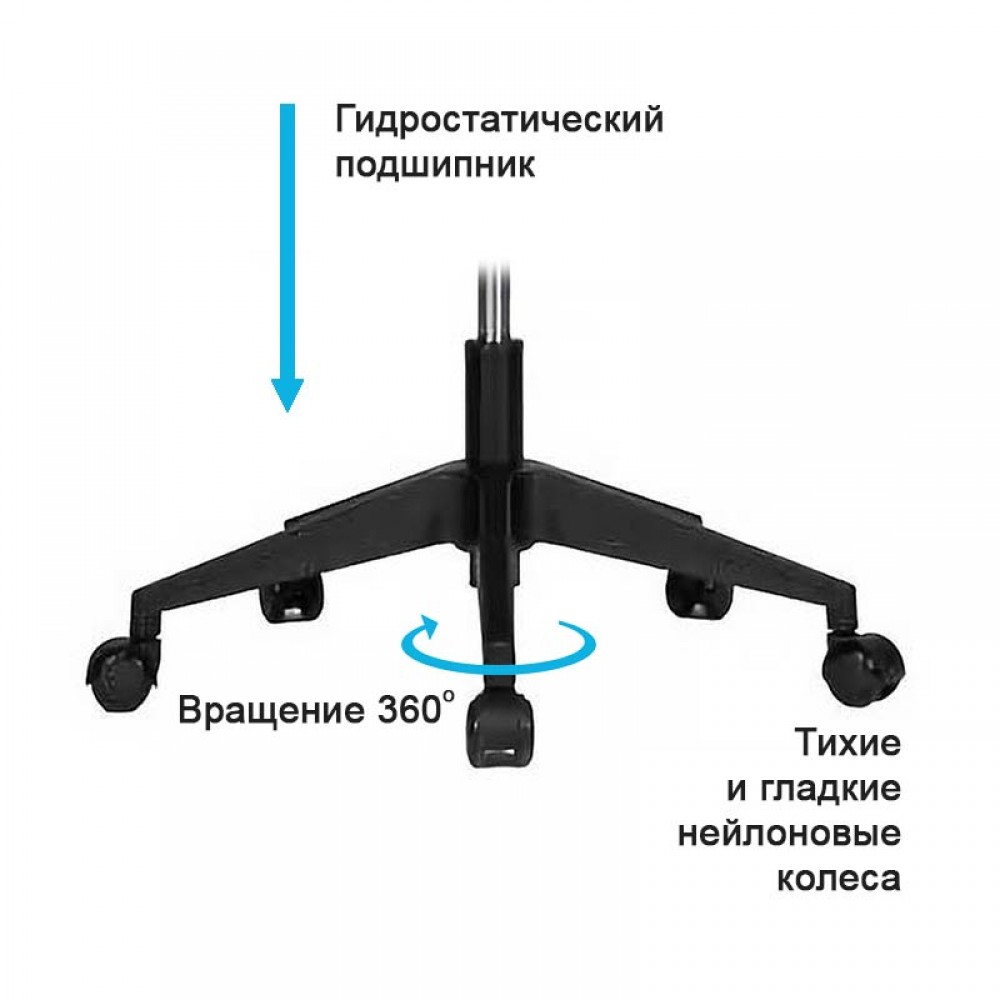 Крестовина стула имеет бесшумные, гладкие, нейлоновые износостойкие колёса. Кресло может свободно вращаться и легко регулируется по высоте.