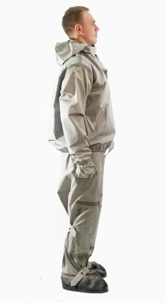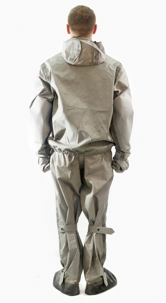 Комбинезон химзащиты Л-1 выполненный из прорезиненной ткани Т-15 состоит из цельноскроенных брюк с чулками, куртки с капюшоном и трёхпалых рукавиц