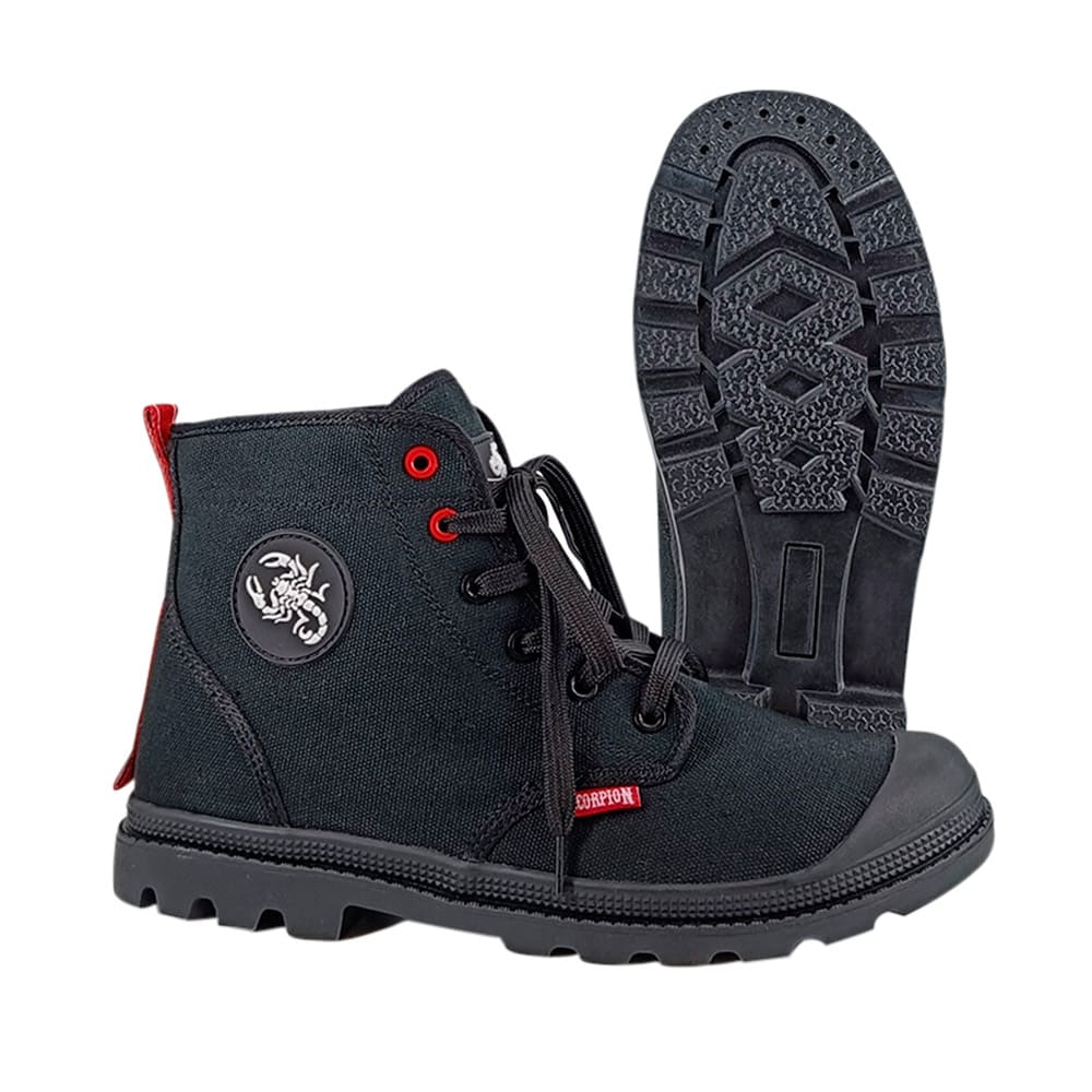 Спецобувь высокие ботинки (кеды) «Скорпион Комфорт» изготовлены из высокотехнологичной хлопчатобумажной ткани CANVAS, имеющей грязе- и водоотталкивающую пропитку, но при этом дышащей. Отделка из современных обувных материалов, что обеспечивает необходимые защитные функции обуви и значительно уменьшает массу.
