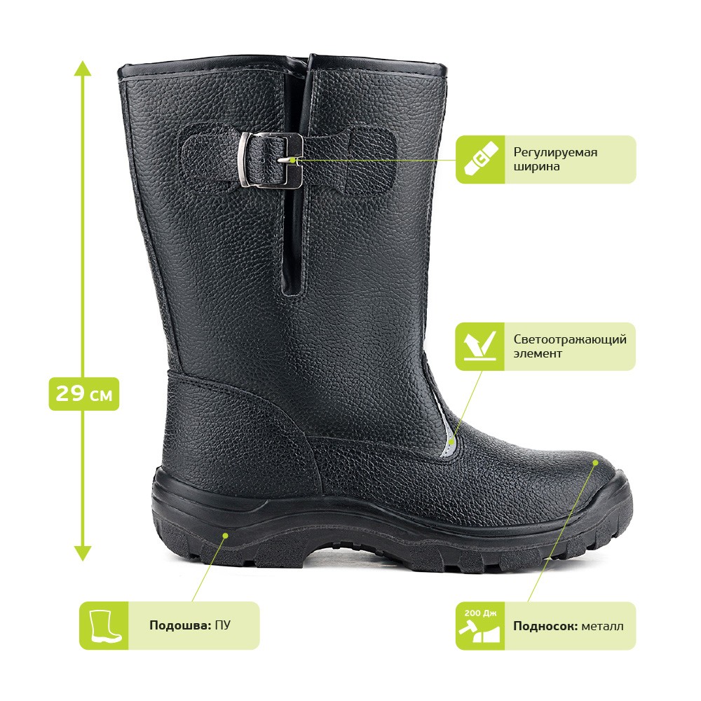 Сапоги кожаные МУН 200 м. 15К предназначены для защиты ног от общих производственных загрязнений в отапливаемых помещениях и на открытом воздухе в летний период. Модель дополнена ремнем с металлической пряжкой для возможности регулировать и комфортно фиксировать ширину голенища. Светоотражающие элементы повышают видимость работников в темное время суток, а также на неосвещенной территории.