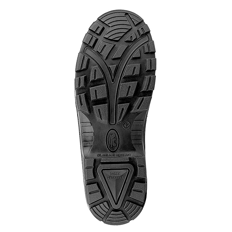 Подошва: однослойная маслобензостойкая полиуретановая подошва литьевого метода крепления имеет вставку в пяточной части подошвы, обладающую амортизационными свойствами и способную гасить ударные нагрузки при ходьбе. Глубина протектора ходового слоя обеспечивает хорошую сцепляемость с поверхностями и препятствует скольжению за счет рельефа протектора.