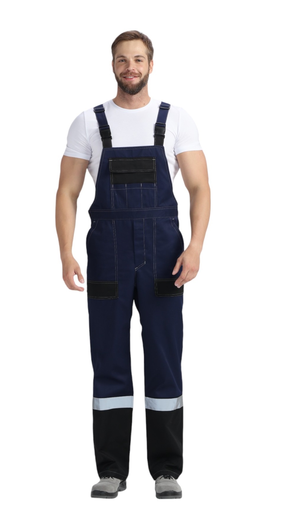 Бретели: регулируются по длине. Благодаря эластичной ленте в талии и бретелях рабочий комбинезон не сковывает движения, удобен в разных рабочих ситуациях.