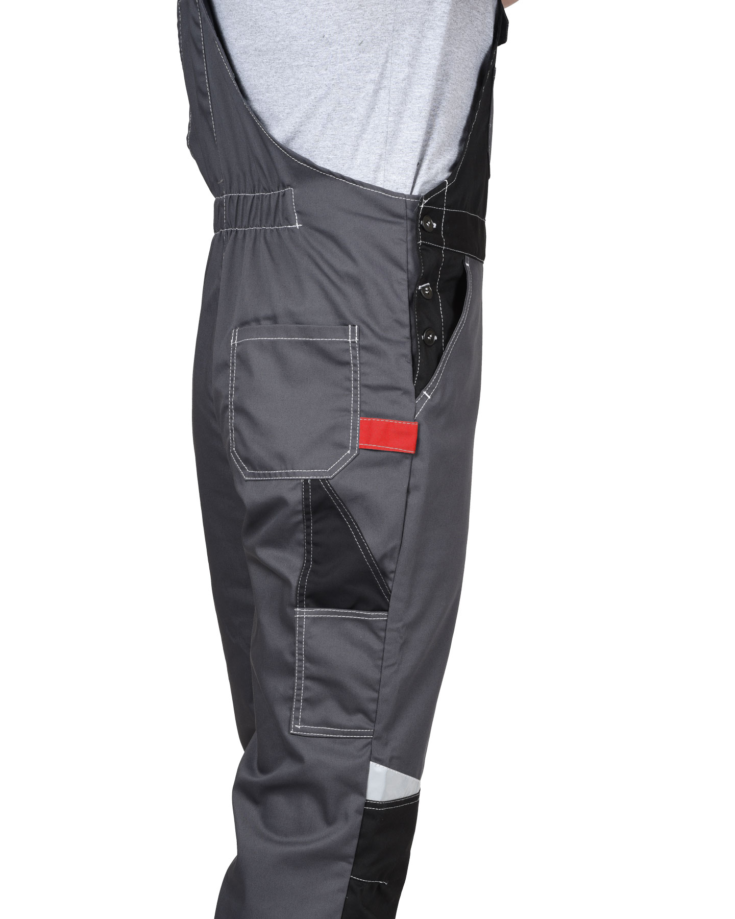 Застежка: гульфик на молнии, левая боковая – на пуговицах.Карманы: 1 нагрудный карман с клапаном на липучку, на левом боковом шве накладной карман с клапаном, 2 боковых кармана, нагрудный карман с клапаном. Сзади 1 накладной карман и карман для инструментов.
