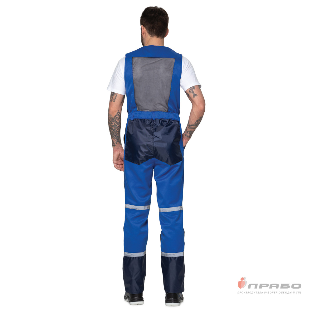 Дополнительно: высокий нагрудник и спинка; объем талии регулируется при помощи резинки; есть 5 шлёвок для ремня; внутренние манжеты (пуфты) на резинке, расположенные внутри брюк, очень плотно облегают любую обувь, не соскальзывая, предотвращая попадание пыли, грязи и воды под штанины; по центру спинки вставка из трикотажной сетки, в области плеча короткие бретели из помочной резинки.