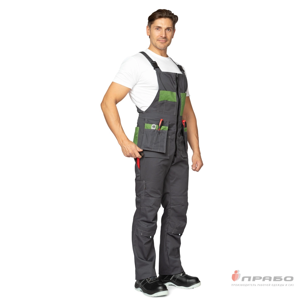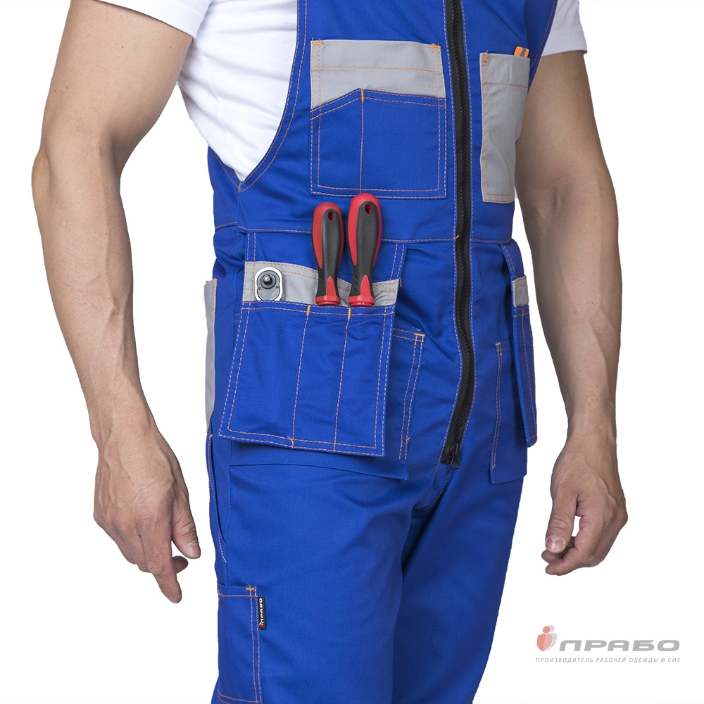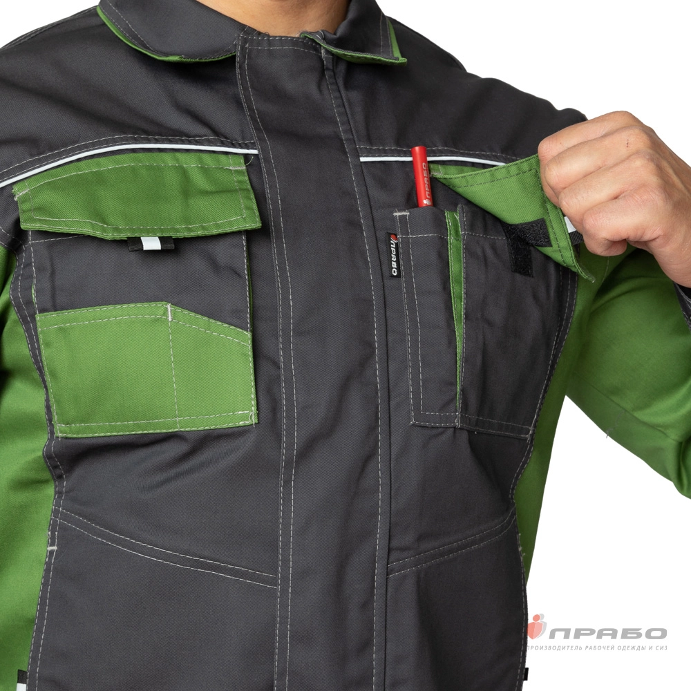 Карманы: верхние накладные, слева двойной усиленный карман с отделением для телефона и карандаша; справа двойной карман с клапаном и два открытых кармана для мелких деталей; 2 боковых нижних кармана; входы в карманы дополнены ранцевой лентой со светоотражающим элементом для удобного расстёгивания.
