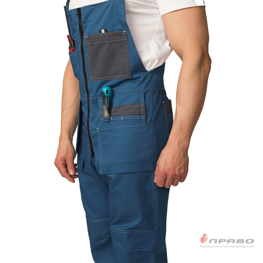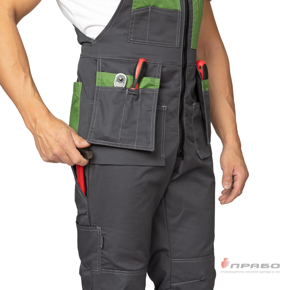 Карманы: 2 нагрудных накладных кармана, справа – двухслойный, верхний – из двух отделений, слева – с застёжкой на контактную ленту; на передних половинах накладные карманы, навесные трёхслойные карманы, верхний слой из трёх отделений; сзади слева – двойной накладной; сзади справа на бедре – карман для инструментов.