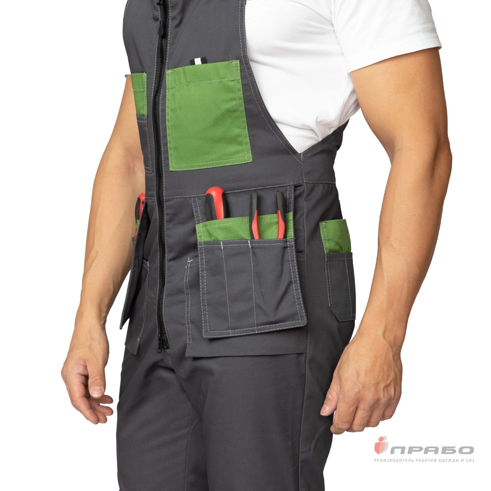 Застежка: открытая на двукзамковой молнии.Карманы: 2 нагрудных накладных кармана, справа – двухслойный, верхний – из двух отделений, слева – с застёжкой на контактную ленту; на передних половинах накладные карманы, навесные трёхслойные карманы, верхний слой из трёх отделений; сзади слева – двойной накладной; сзади справа на бедре – карман для инструментов.