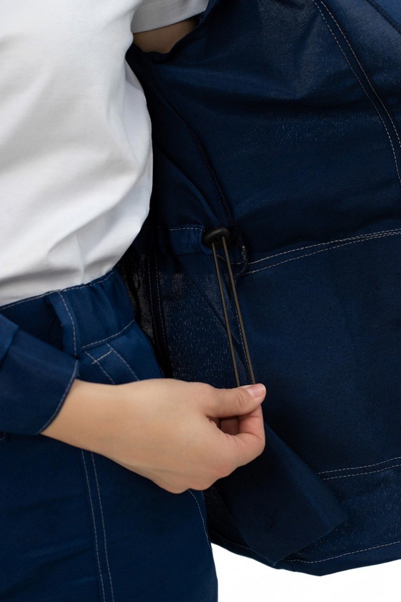 Фасон куртки: прямая, удлиненная, в области талии кулиса со шнуром и фиксатором.