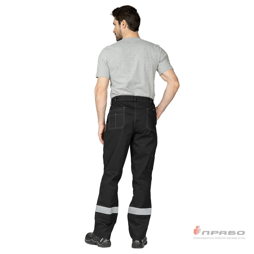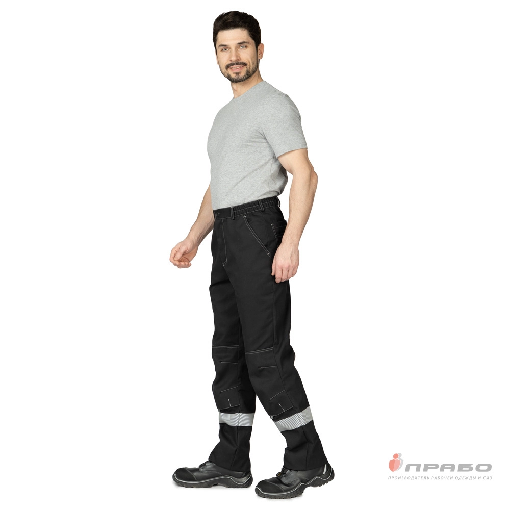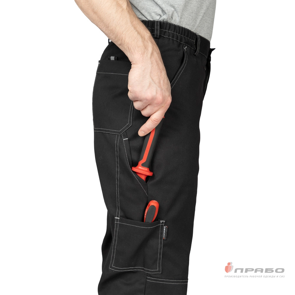 Карманы: передние с наклонным входом, задние накладные карманы, застёжка на контактную ленту, боковой фигурный накладной карман для инструментов.
