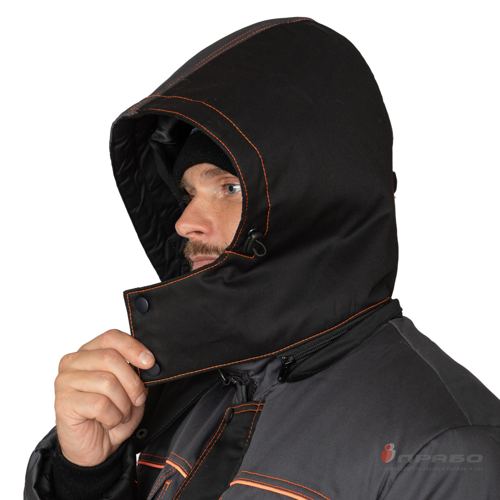 Капюшон: утеплённый, пристегивается к горловине на молнию, по лицевому вырезу регулируется с помощью шнура с фиксаторами; по глубине капюшон регулируется в затылочной части с помощью хлястика на пряжке; подбородочная часть капюшона застегивается на кнопки; увеличенный объём капюшона позволяет надевать его поверх головных уборов, касок и шлемов.