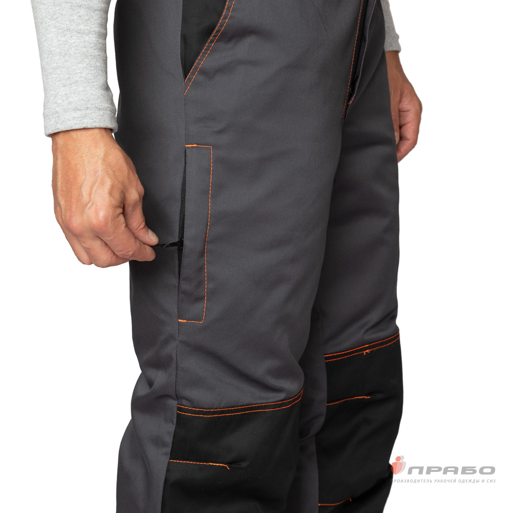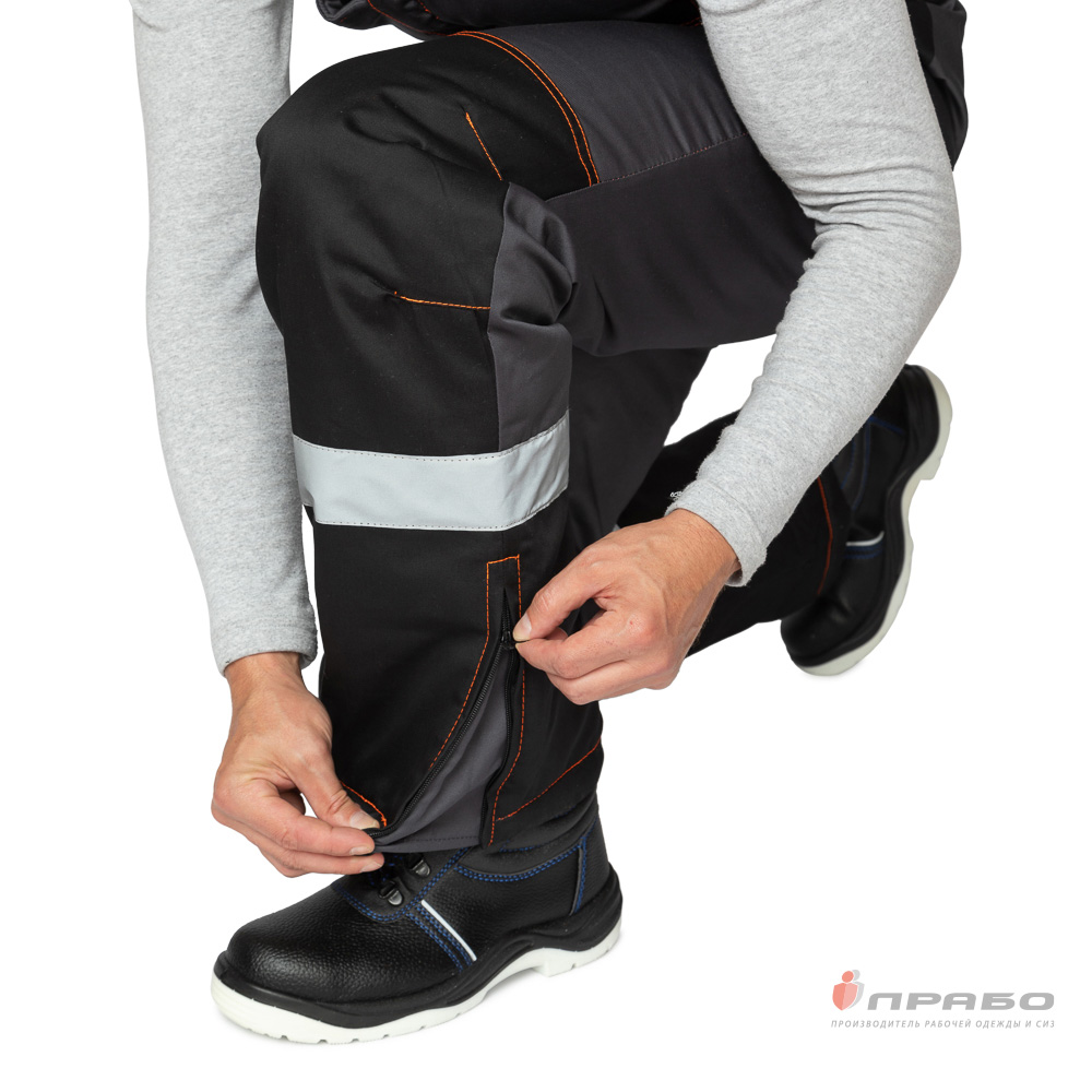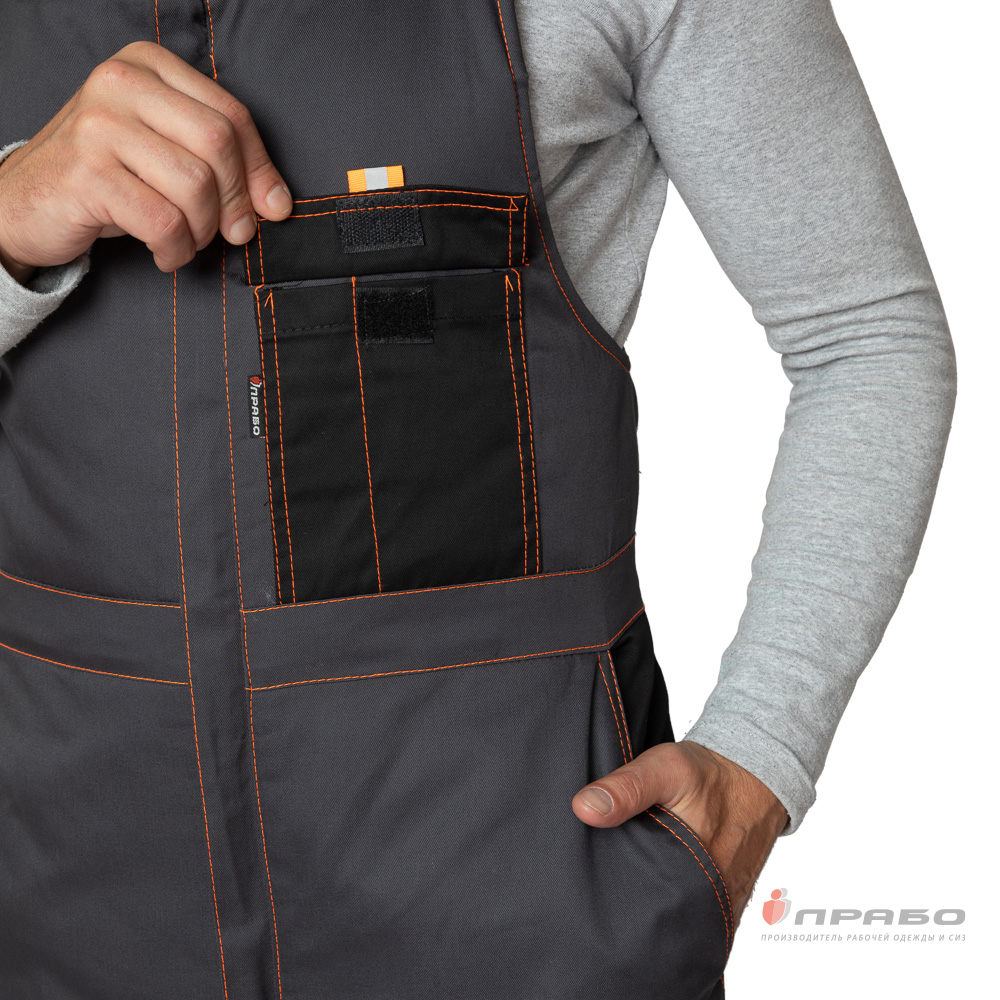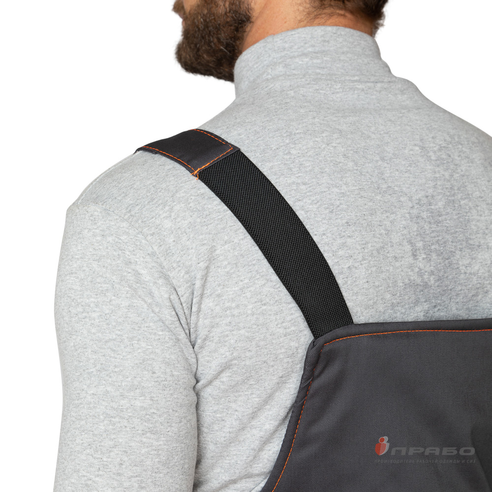 Дополнительно: плотность прилегания к талии регулируется поясом с резинкой; бретели регулируются застёжками-фастексами; на коленях анатомические вытачки; по низу брючин в боковых швах расположены разрезы, застегивающиеся на молнию; ширина разреза регулируется вставкой из основной ткани, что позволяет удобно надевать и снимать обувь за счет возможности увеличить ширину нижней части брюк; на коленях анатомические усилительные накладки, усиленные двойные швы.