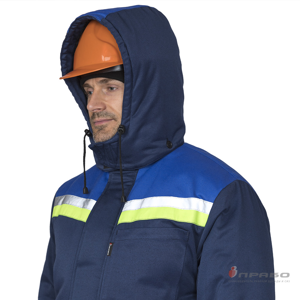 Капюшон: съёмный с притачной утеплённой подкладкой, застёгивается на контактную ленту, регулируется по объёму с помощью кулиски с фиксаторами и наконечниками, пристёгивается к верхнему воротнику на три пуговицы; он достаточно глубокий и может использоваться с каской.
