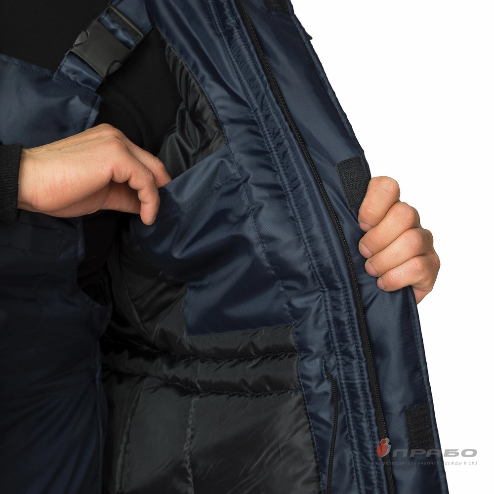 Застежка: центральной застёжкой на двухзамковую молнию, с косой вставкой.Карманы: на нагруднике накладной карман, на уровне бёдер накладные карманы с утеплённым клапаном с застёжкой на липучке.