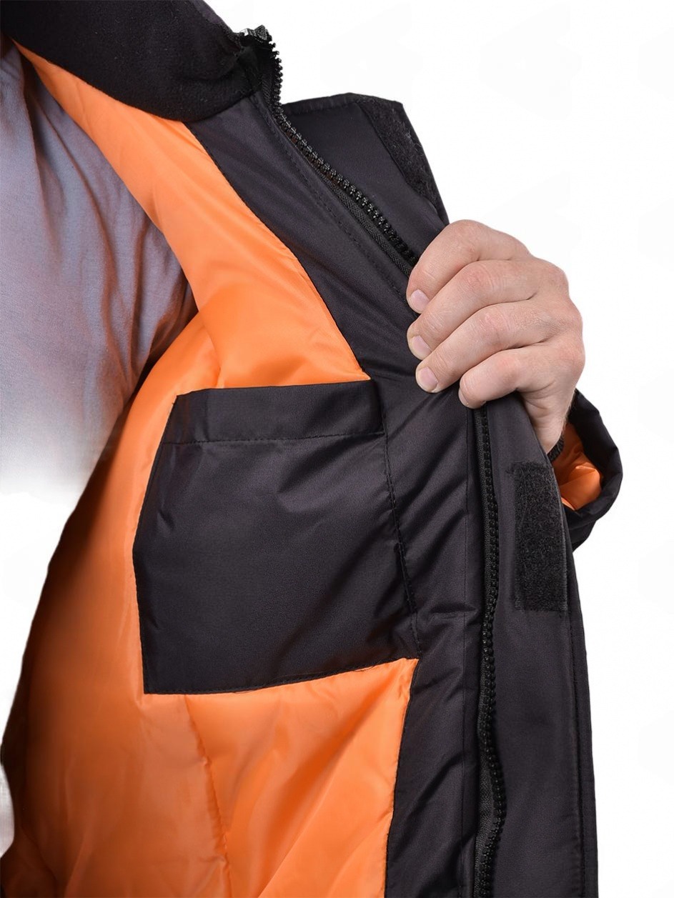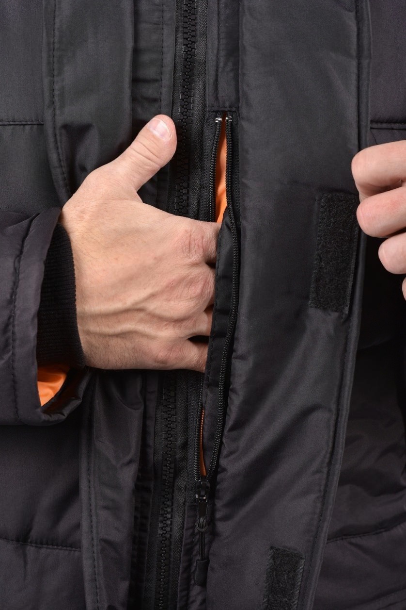 Карманы: два верхних прорезных с клапаном на замке для рук, два нижних с клапаном, есть внутренний карман на и липучке для мобильного телефона и один дополнительный потайной на замке.