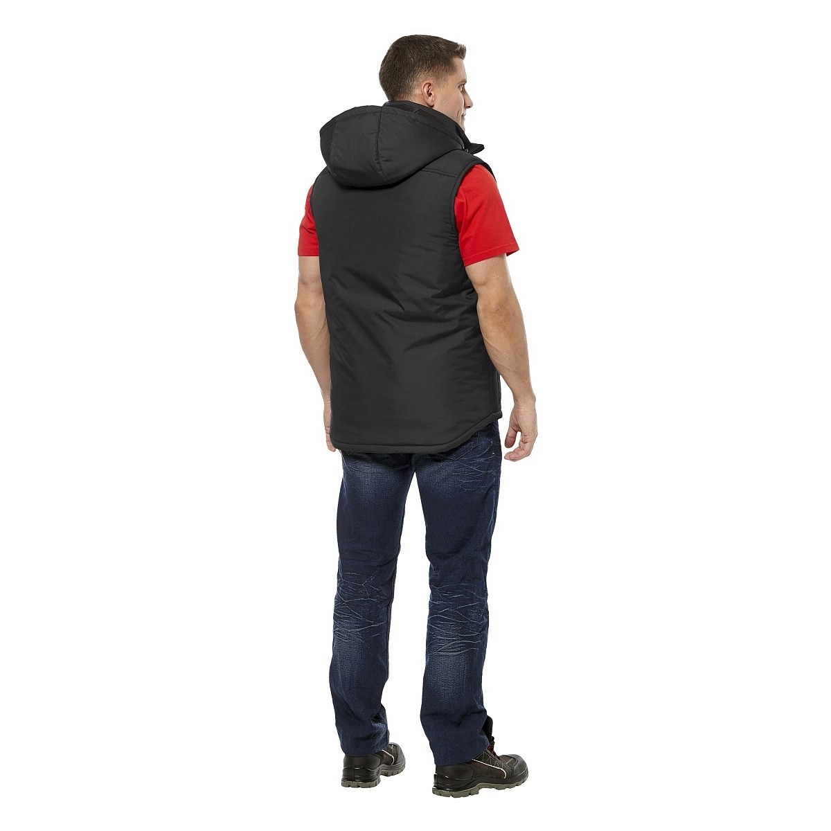 Жилет утепленный с удлиненной спинкой для дополнительной защиты и с центральной застежкой на тесьму-«молнию». Цвет черный с красной декоративной отделкой на карманах и внутренней частью воротника из мягкого флиса красного цвета.