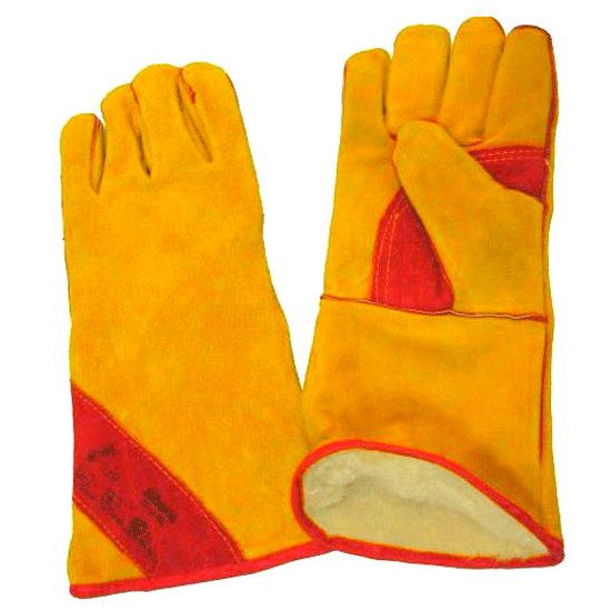 Краги спилковые утепленные желтые пятипалые с подкладкой из искусственного меха. Специальная обработка обеспечивающая сохранение мягкости спилка, швы усилены вставками из кожи, на ладонной части и большом пальце дополнительный слой из спилка красного цвета. Краги обеспечивают высокую механическую защиту, защиту от пониженных и повышенных температур — открытого пламени, искр и брызг расплавленного металла.